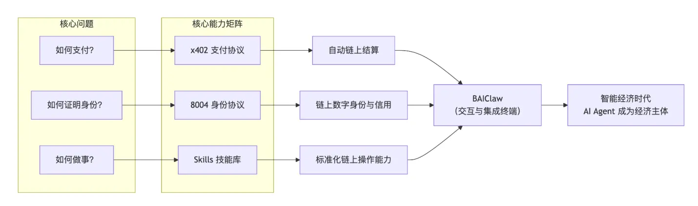 要实现这一图景,B.AI 从协议层与应用层同时入手,分别集成了x402支付协议、8004身份协议、Skills,以及BAIClaw智能助手,共同构成了B.AI的核心能力矩阵,将AI从“聊天工具”升级为能够直接参与链上经济活动、自主执行任务的“经济主体”。