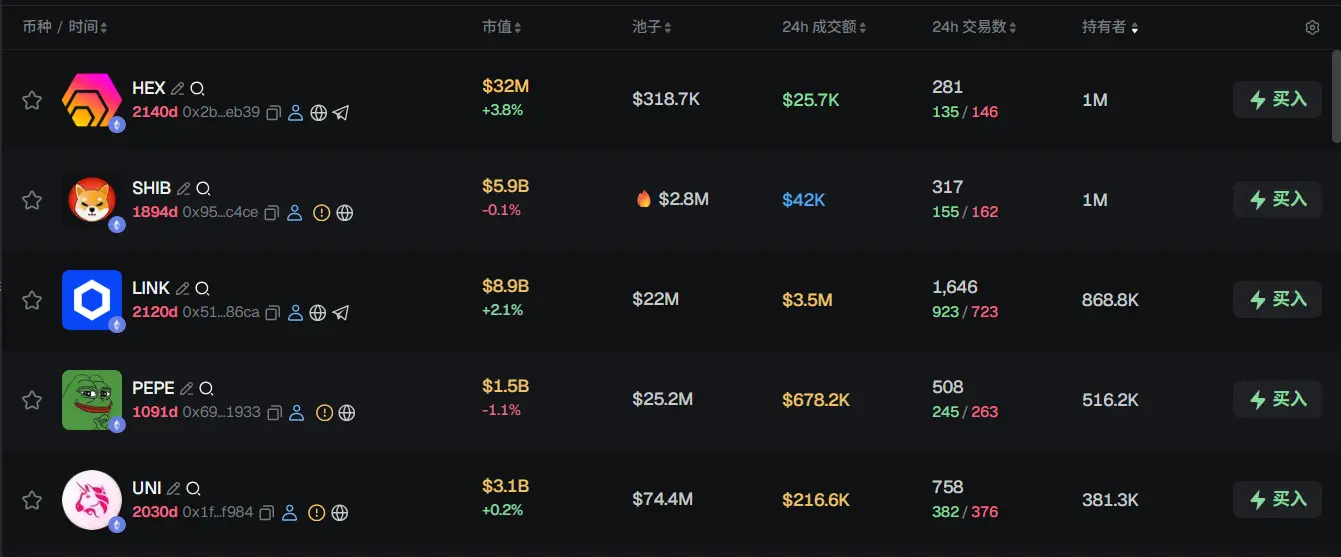过去 24h ETH 热门代币前五依次为:HEX、SHIB、LINK、PEPE、UNI
