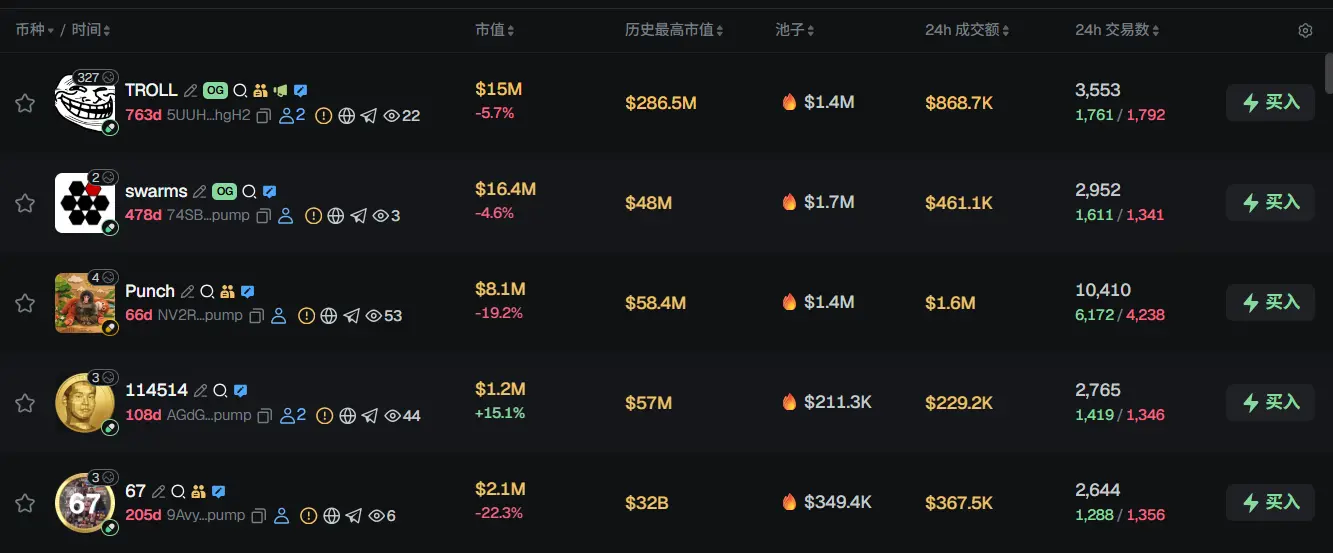 过去 24h Solana 热门代币前五依次为:TROLL、swarms、Punch、114514、67