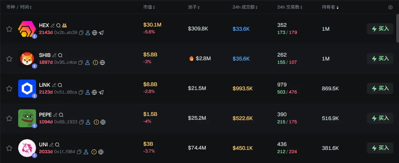 过去 24h ETH 热门代币前五依次为:HEX、SHIB、LINK、PEPE、UNI