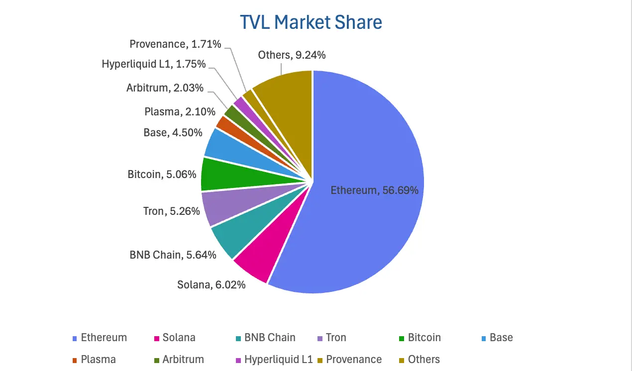 按公链进行划分,其中TVL最高的三条公链分别是Ethereum链,占比56.69%;Solana链,占比6.02%;BNB Chain,占比5.64%。