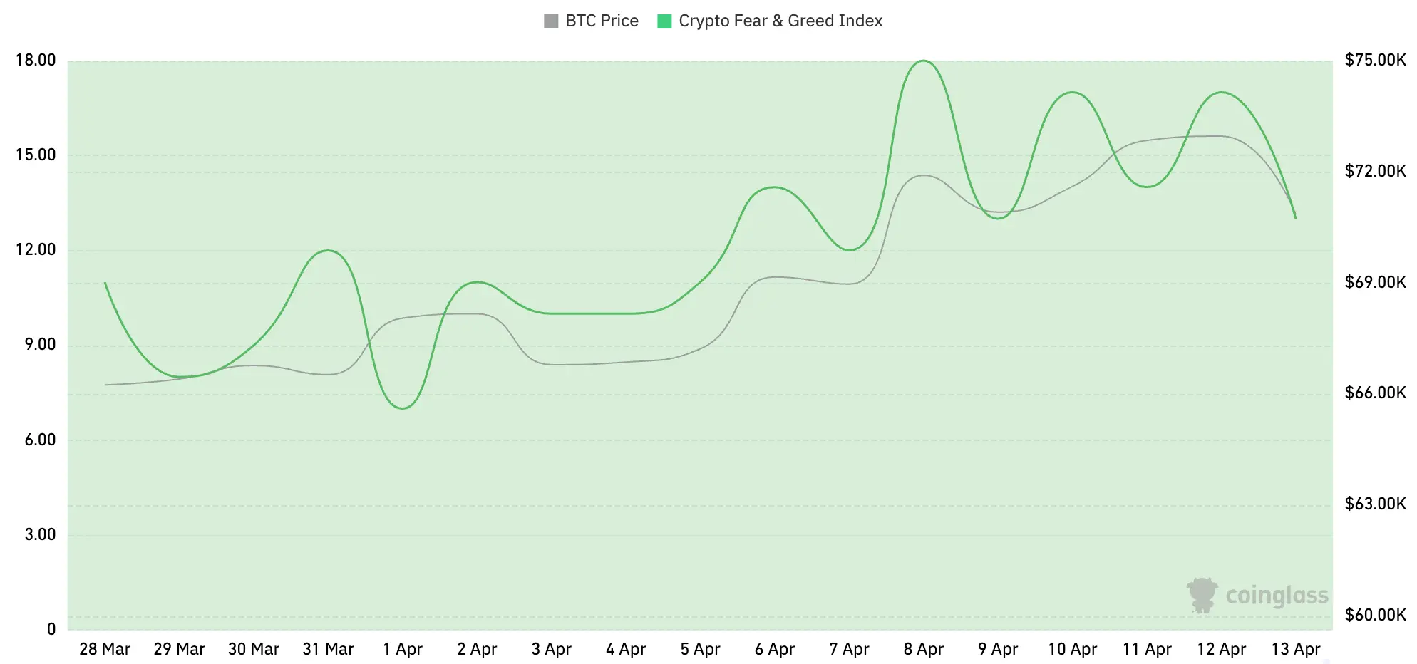 加密货币恐慌指数为13,显示为极度恐慌。