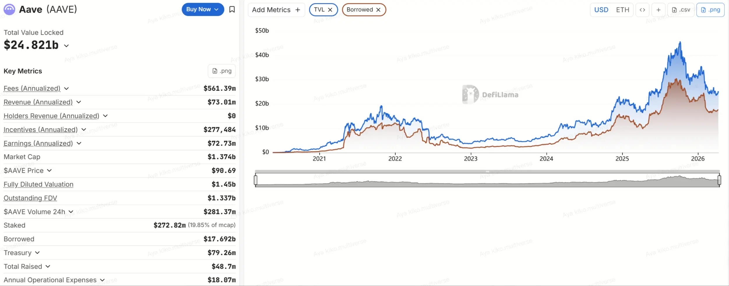 根据DefiLlama数据,截至 2026年4月9日,DeFi 借贷赛道 TVL 约 $51B,全网总借出约 $34.4B。 Aave 的 TVL 约 $24.8B、借出约 $17.6B,其中以太坊占 TVL 约 $20B,其余分布在 Plasma、Arbitrum、Base、Mantle、Avalanche 等多链。