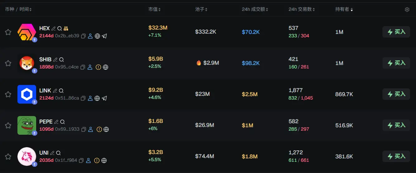 过去 24h ETH 热门代币前五依次为:HEX、SHIB、LINK、PEPE、UNI