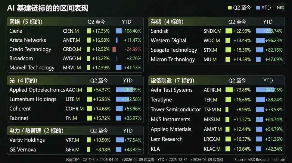 从区间表现看,Q2 以来弹性最强的是 AEHR.M 和 AAOI.M;YTD 维度上,AAOI.M、SNDK.M、AEHR.M、LITE.M 的涨幅更靠前,也更能直观看出 AI 基建链内部已经走出了明显分化。