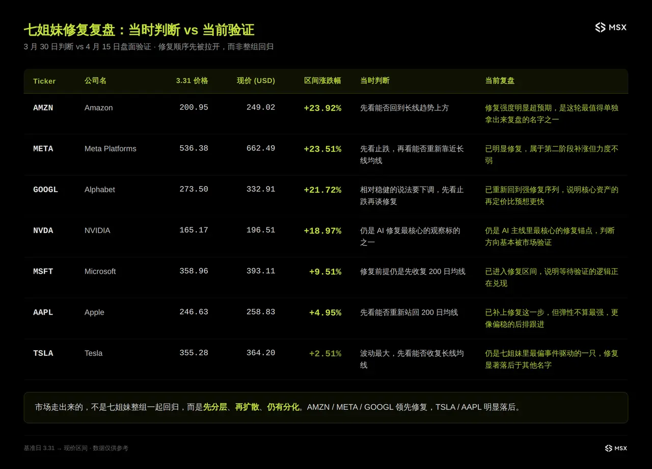 它更像是市场用盘面本身,回答了一个 3 月底争论最激烈的问题:七姐妹这一轮,到底是整组回归,还是会先分出顺序。