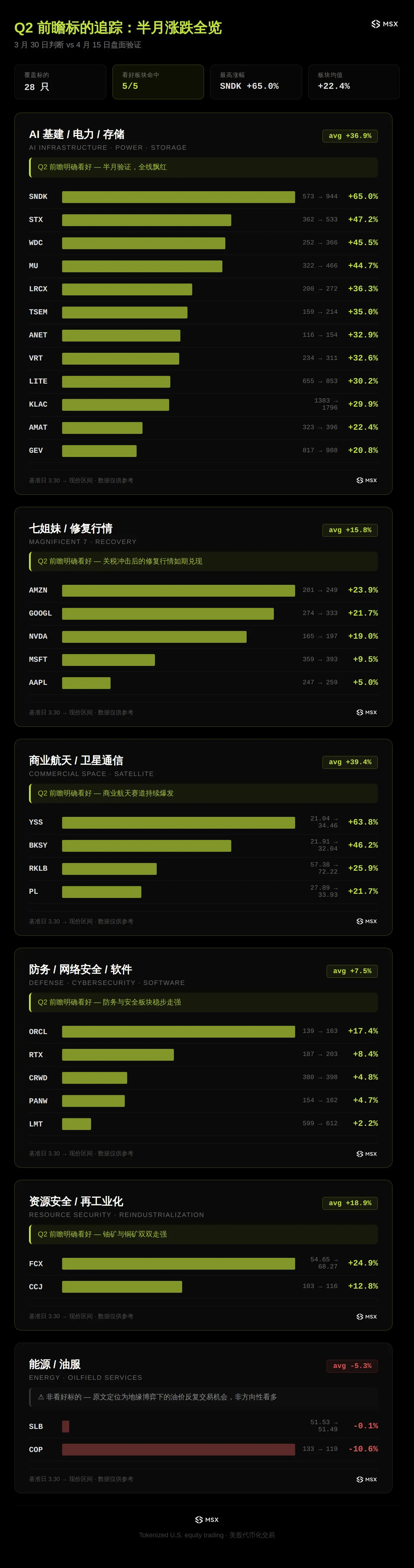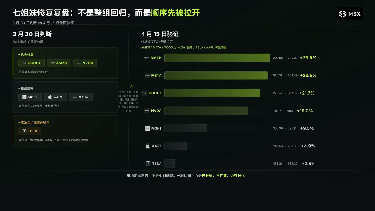 说实话,市场上从来不缺复盘,也不缺事后总结。真正稀缺的,往往是在分歧最大的时候,有没有人能先把重点拎出来,而 3 月底那篇 Q2 前瞻,正是没有去追一个更热闹、更容易传播的结论,而是先把这轮行情最关键的东西摆在前面:七姐妹不会整组回归,市场会先分出修复顺序,真正决定后面空间的,也不是第一波谁弹得最快,而是谁能在后续的业绩、趋势和风险偏好里继续站稳。