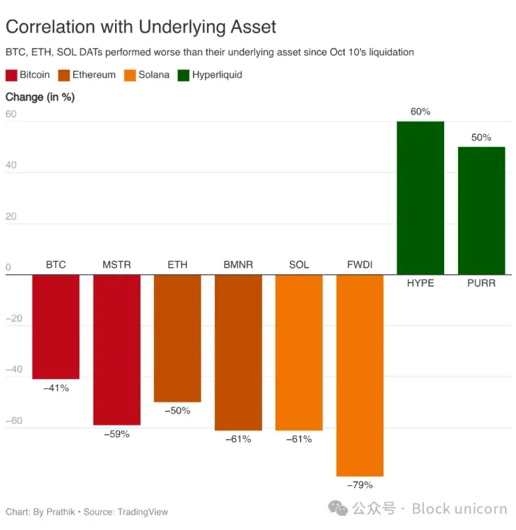基于比特币的 DAT(例如 Strategy)提供与 BTC 价格挂钩的杠杆收益。投资者为此支付了溢价。当加密货币价格上涨时,这种飞轮效应得以发挥作用;但当市场暴跌时,这种效应也随之瓦解。DAT 能否在市场周期中持续运作的关键在于其升值与哪些标的资产挂钩。大多数围绕 BTC 和 ETH 的加密货币金库都是对标的加密货币价格上涨的杠杆押注。