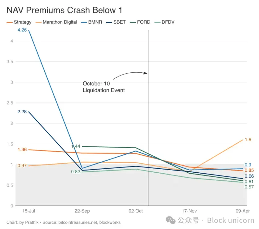快进到 11 月中旬,我们看到几个月来人们对 DAT 的担忧实时发生:mNAV 下滑、国债购买放缓以及 DAT 公司股价下跌。