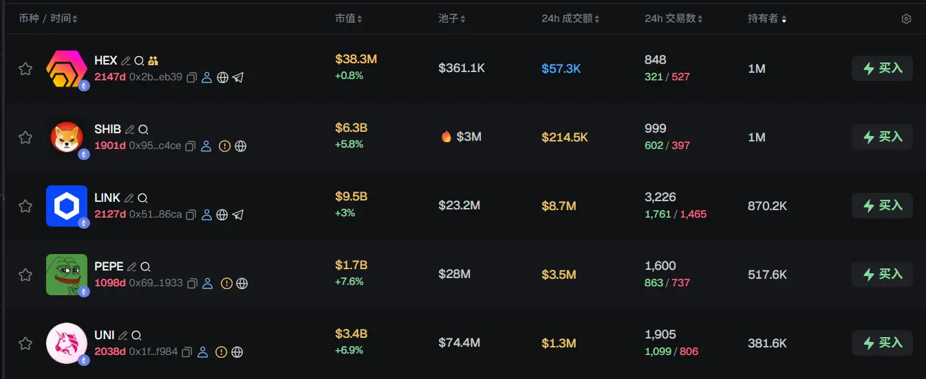过去 24h ETH 热门代币前五依次为:HEX、SHIB、LINK、PEPE、UNI