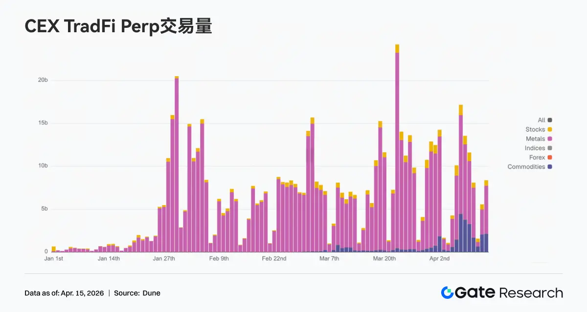 CEX TradFi 永续合约交易量整体维持在高位区间震荡,并呈现出“结构集中 波动放大”的特征。具体来看,交易量仍以金属类资产为绝对主导,尤其是黄金相关品种在宏观不确定性与通胀预期反复的背景下持续吸引资金参与,成为主要成交来源;与此同时,商品类尤其能源在周内亦出现阶段性放量,反映出市场对原油及宏观事件的交易需求上升。节奏上,周中交易量明显放大,对应宏观数据与地缘事件催化,随后虽有回落,但整体仍高于前期中枢,显示资金活跃度维持高位。结构上看,TradFi 交易正从单一避险资产驱动,逐步扩展至“黄金 原油 指数”的多资产联动框架,体现出用户从配置型交易转向以宏观波动为核心的策略交易。