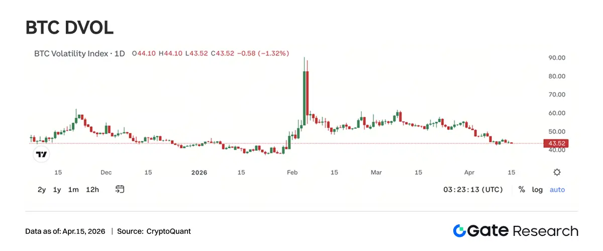 BTC DVOL 当前约 44.76,已从 2 月初地缘冲突触发的 90 极端水平持续回落,基本回归 1 月中旬的基线区间。4 月停火事件仅带来短暂脉冲(45→50),随后快速回落,市场已不再对单一地缘事件给予高波动溢价。当前 DVOL 接近半年均值支撑(45–48 区间),若进一步下探至 40 附近,将进入历史低波区间。ETH DVOL 当前约 65.50,同样回落至冲突前水平,但相对 BTC 仍高约 20 vol point。结合大宗交易中大量卖跨、卖波动策略,可以确认市场主流判断为低波震荡环境。整体来看,波动率已进入压缩尾声阶段,卖方收益空间收窄,但同时也为中期买入波动策略提供了更具性价比的入场窗口。
