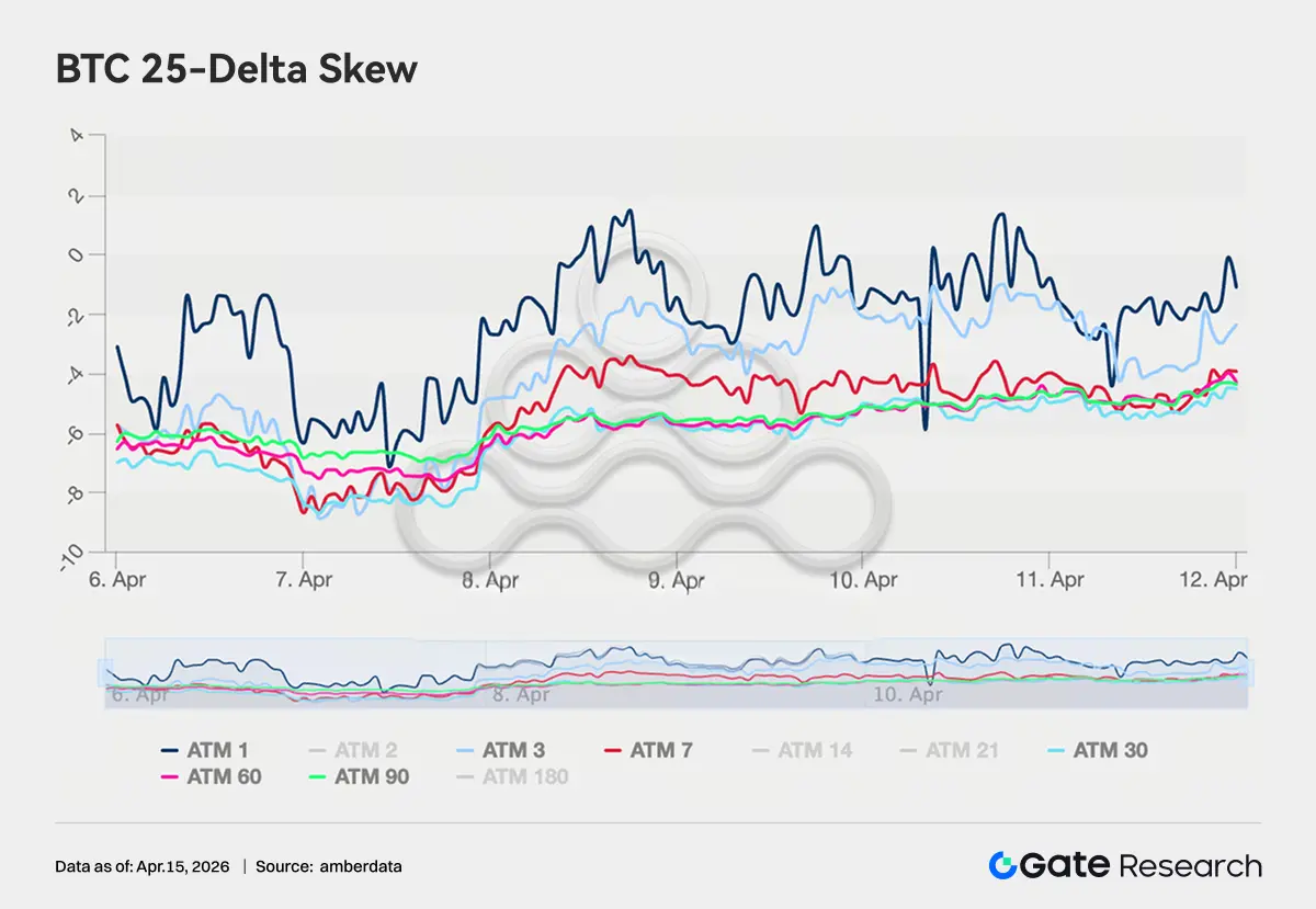 BTC 25-Delta Skew 全期限维持在 -4 至 -8 vol 区间,Put 溢价仍然主导,市场整体仍保持对下行风险的对冲需求。但相较 3 月底 -8 至 -11 vol 的极端区间,Skew 已明显抬升约 2–3 个 vol point,反映看空情绪边际缓和。ETH Skew 变化更为显著,由此前的 -5 至 -8 vol 区间整体上移至 -3 至 2 vol,部分期限甚至接近对称,说明市场对尾部下跌风险的定价明显收缩。不过,长端 Skew 仍未明显转正,机构层面尚未完全转向进攻,整体维持降低防御但不彻底解除的配置状态。