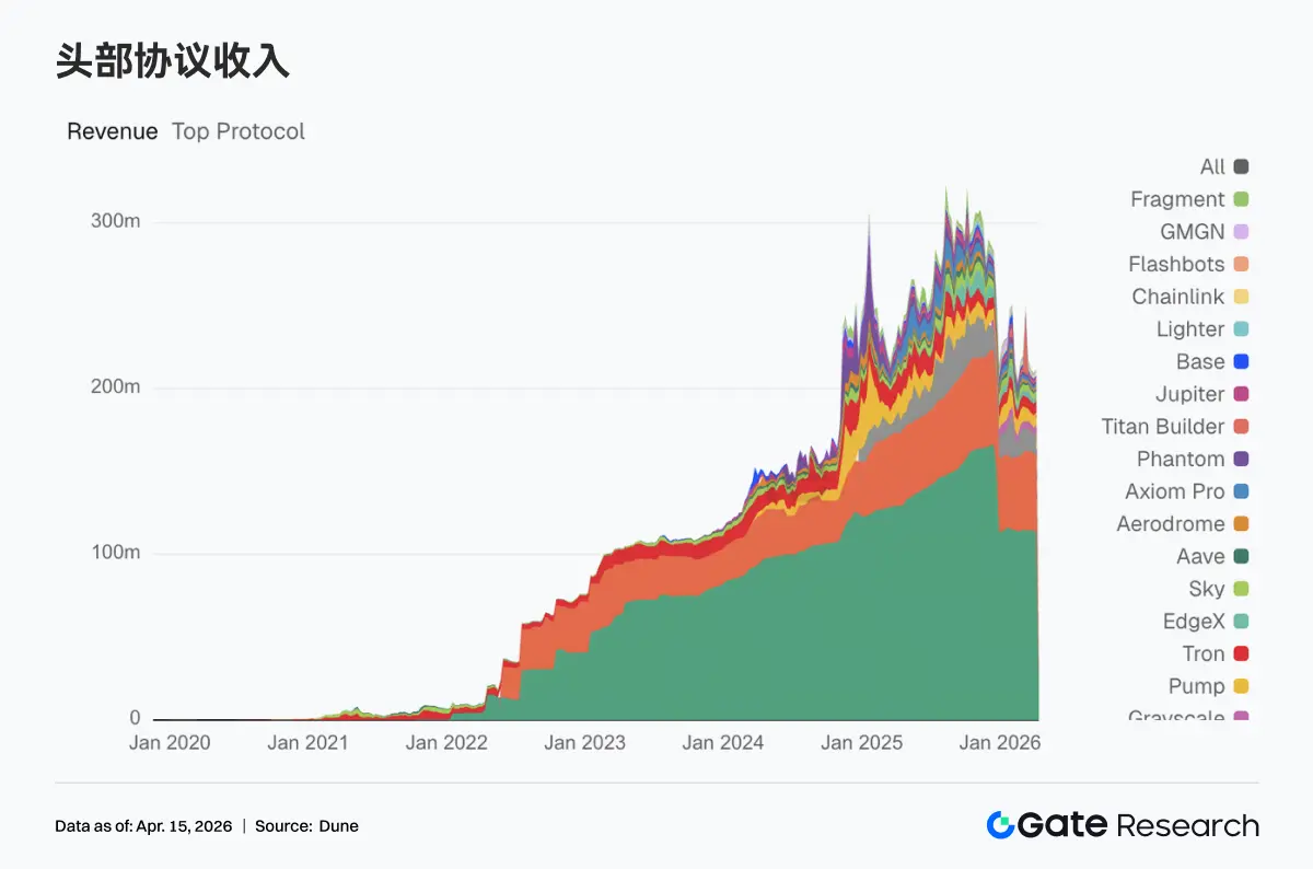 • 协议收入体现向基础设施层回流,交易与清算类协议走强,前端入口与流量分发热度回落。