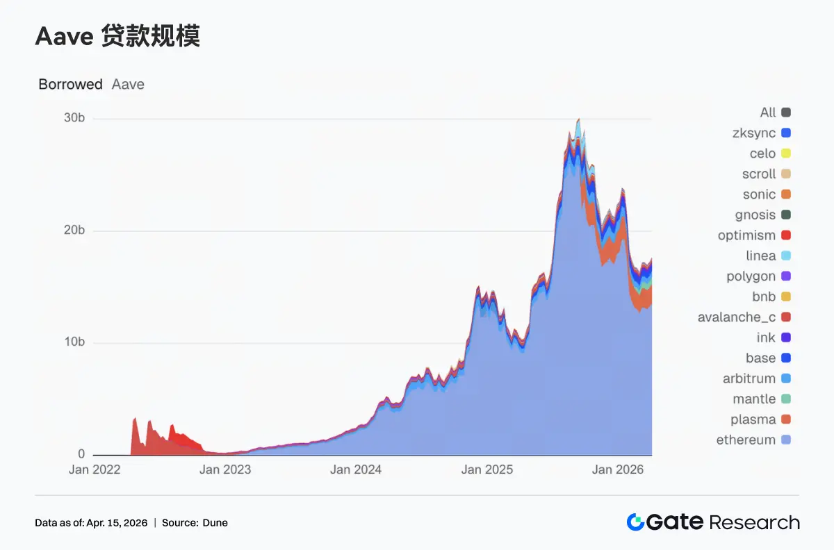 Aave 借贷规模升至约 176.9 亿美元,高于前一周的 172.5 亿美元。其中,Ethereum 主市场由 132.7 亿美元升至 135.7 亿美元,成为拉动总盘的核心力量。与此同时,Plasma 从 16.6 亿美元增至 17.1 亿美元,Mantle 由 5.9 亿美元升至 6.4 亿美元,Base 与 Arbitrum 也均站上 5.17 亿美元左右,多链借贷需求同步回暖。相较之下,Avalanche、BNB Chain、Polygon 等次级市场变化不大,新增融资需求仍主要集中在流动性最深、交易效率最高的几条主线上。