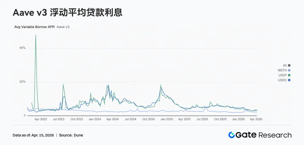 3.5 Aave 资金利率分化,USDC 走松,USDT 与 WETH 利率抬头