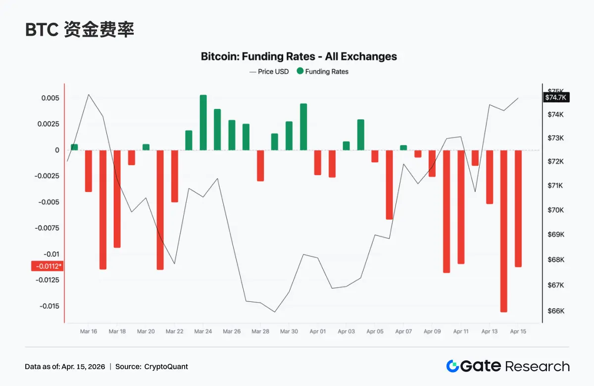BTC 全市场未平仓合约在过去一周从约 22.5B 附近快速上行至 25.3B 左右,并与价格同步反弹至 $74K 上方,杠杆资金正在明显回流市场。值得注意的是,中间一度在 4 月 11 日出现 OI 快速下探(类似集中平仓或挤出),随后迅速修复并创出新高,这种先去杠杆后再加杠杆的结构通常意味着弱势仓位被清洗后,新的趋势资金接力入场。结合资金费率持续为负来看,当前 OI 的回升可能由做空与对冲仓位驱动,市场处于高杠杆、方向分歧但偏空的状态,一旦价格继续上行,仍存在进一步挤空放大的空间。