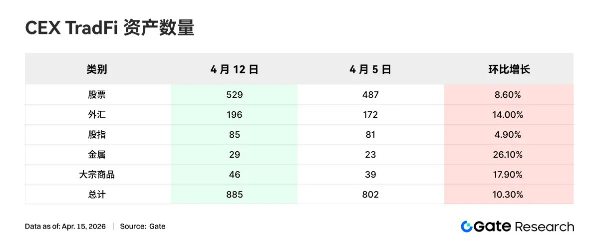 近一周 CEX TradFi 资产类别数量进一步扩张,三家主流 CEX 在 TradFi 资产类别(仅统计 TradFi 与 CFD 板块,不含永续合约)总数由 802 增至 885,环比增长 10.3%。其中金属类增长最为显著,由 23 支增长至 29 支,环比增长 26.1%;大宗增速排名第二,由 39 支增长至 46 支,环比增长 17.9%。