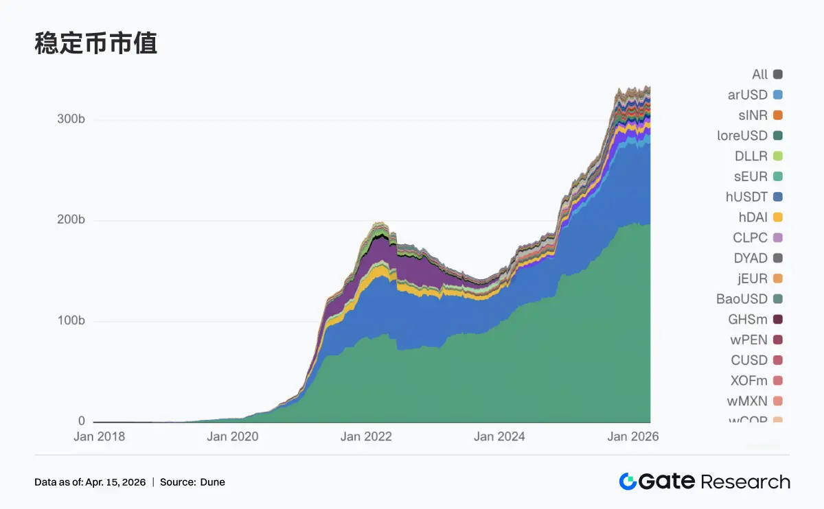 稳定币板块本周并未出现剧烈波动,整体在高位区间内进行结构调整。USDT 与前一周相比变化不大,底层美元流动性依旧稳定。USDC 由 7,986.8 亿美元回升至 8,104.9 亿美元,成为本周最明确的增量来源,显示资金重新增配主流结算型美元资产。另一侧,USDS、USDe、DAI、GHO 均出现小幅下滑,去中心化稳定币板块本周未能形成合力。在边际变化方面,USDG 与 PYUSD 双双回升,支付型与新发行稳定币内部仍在发生新的资金分流。