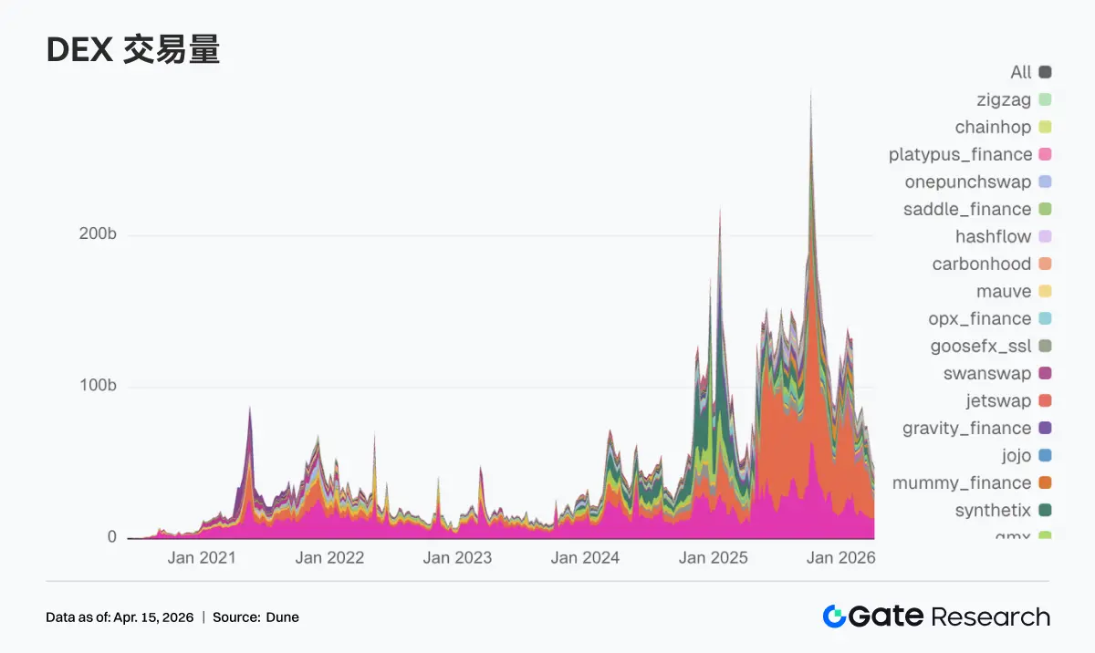 • 交易结构转向宏观高波动资产与头部平台,资金集中原油等能源品种,DEX 端回归 Uniswap 等高流动性平台。