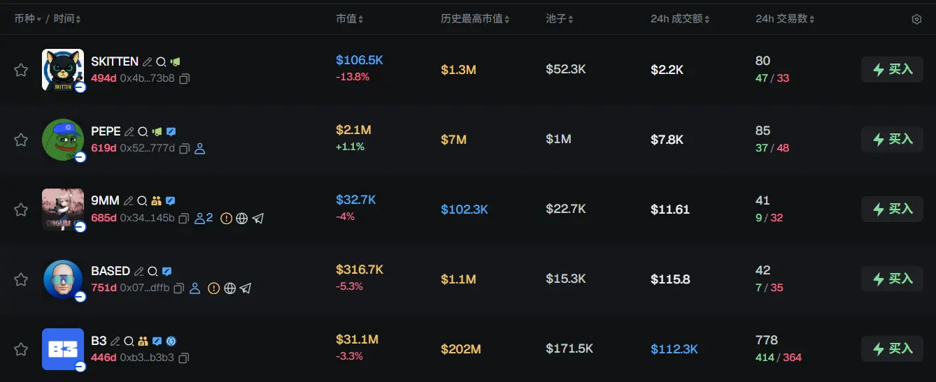 过去 24h Base 热门代币前五依次为:SKITTEN、PEPE、9MM、BASED、B3