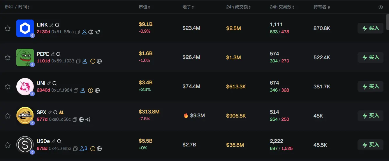 过去 24h ETH 热门代币前五依次为:LINK、PEPE、UNI、SPX、USDe