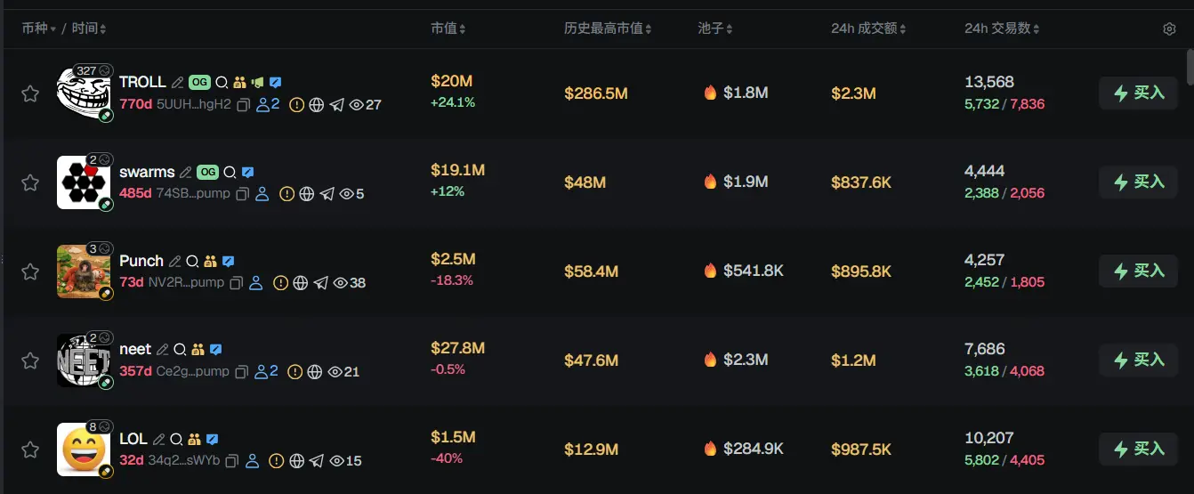 过去 24h Solana 热门代币前五依次为:TROLL、swarms、Punch、neet、LOL
