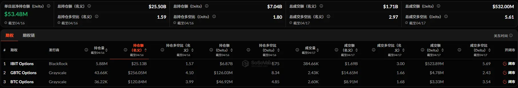 截至 4 月 16 日,美国比特币现货 ETF 期权名义总持仓额达 255.0 亿美元,名义总持仓多空比达 1.59。