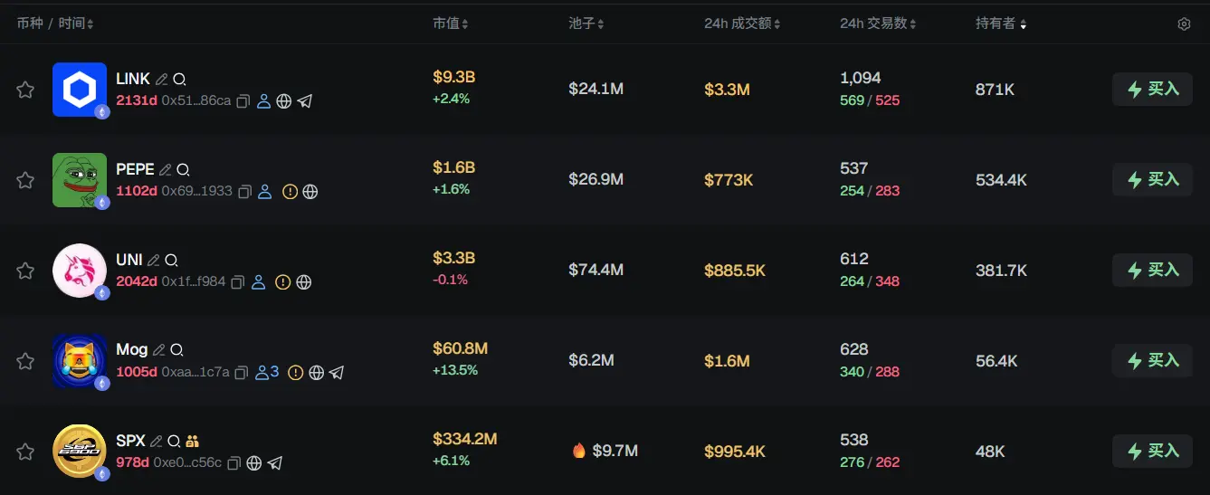 过去 24h ETH 热门代币前五依次为:LINK、PEPE、UNI、Mog、SPX