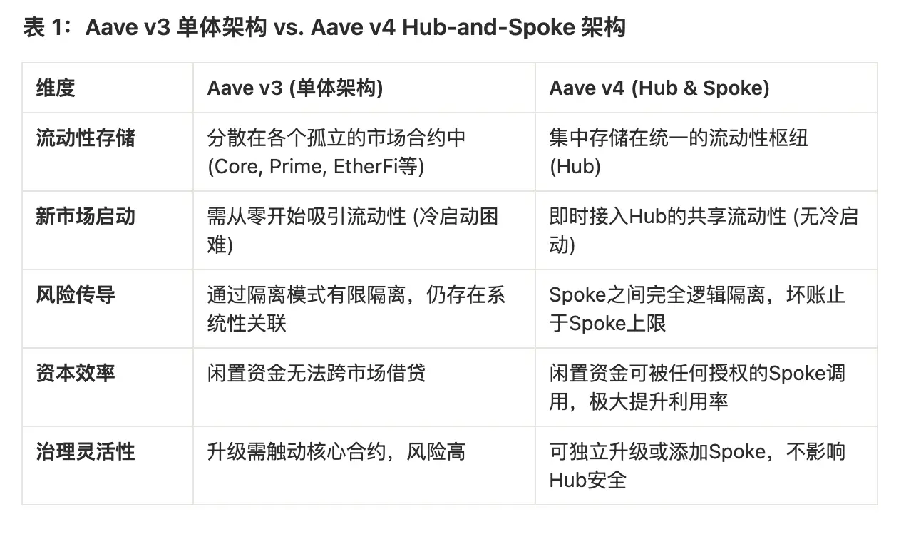 在v3及之前的版本中,Aave在每条链(甚至同一条链的不同市场,如Core和Prime)上的部署都是独立的。以太坊上的USDC无法被Arbitrum上的借款需求即时利用,导致资金闲置和利率效率低下。Aave v4 通过Hub-and-Spoke架构解决了这一问题。