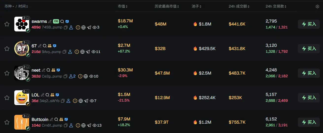 过去 24h Solana 热门代币前五依次为:swarms、67、neet、LOL、Buttcoin