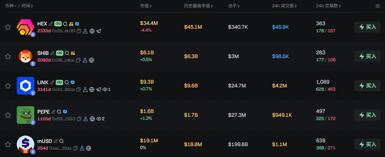 过去 24h ETH 热门代币前五依次为:HEX、SHIB、LINK、PEPE、mUSD