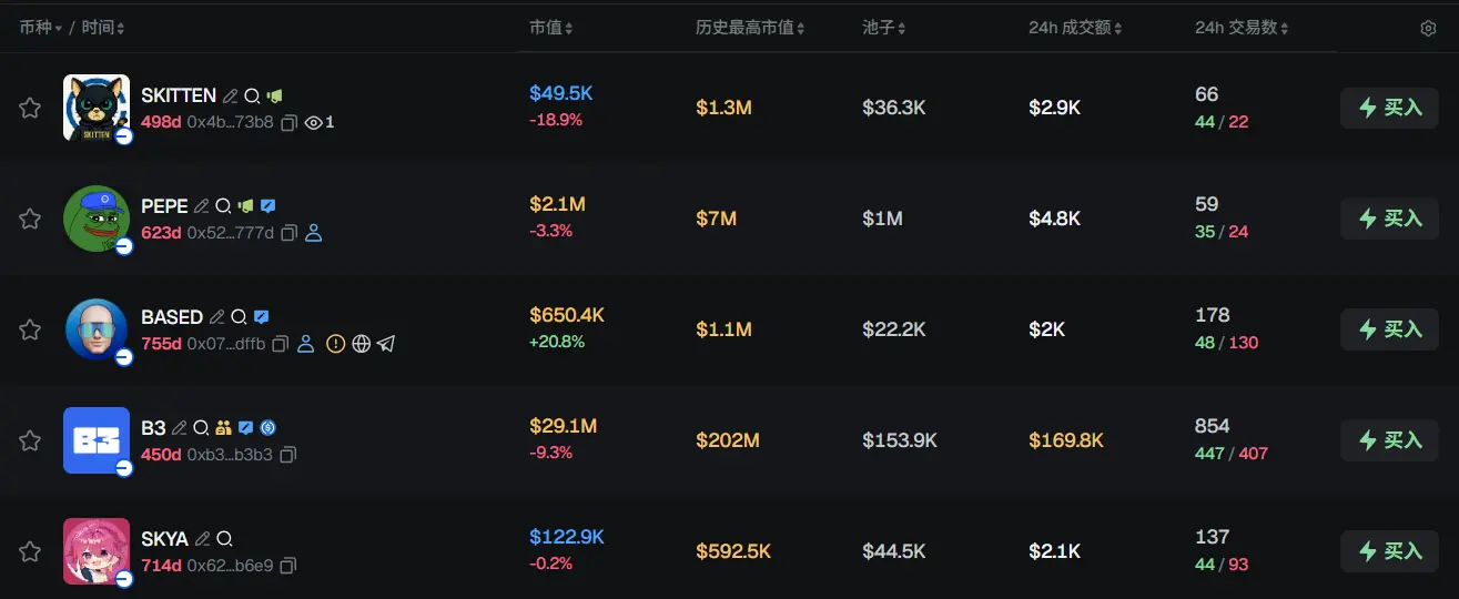 过去 24h Base 热门代币前五依次为:SKITTEN、PEPE、BASED、B3、SKYA