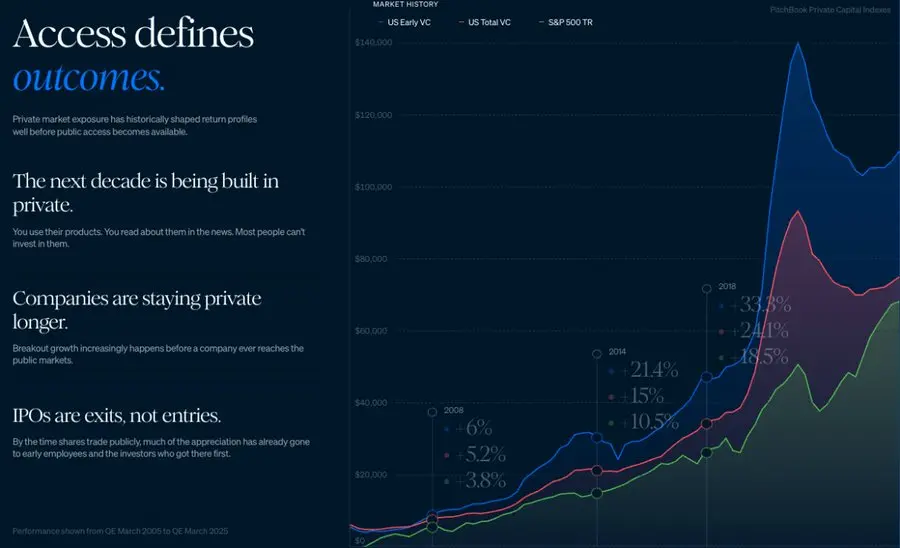 很多最重要的公司,在进入公开市场之前,就已经完成了多轮巨额融资和价值跃迁。等普通投资者终于可以通过 IPO 或二级市场买入时,故事往往已经被讲了很多遍,估值已经被前几轮资本充分定价,真正不对称的 alpha 早已被私募资本提前捕获。