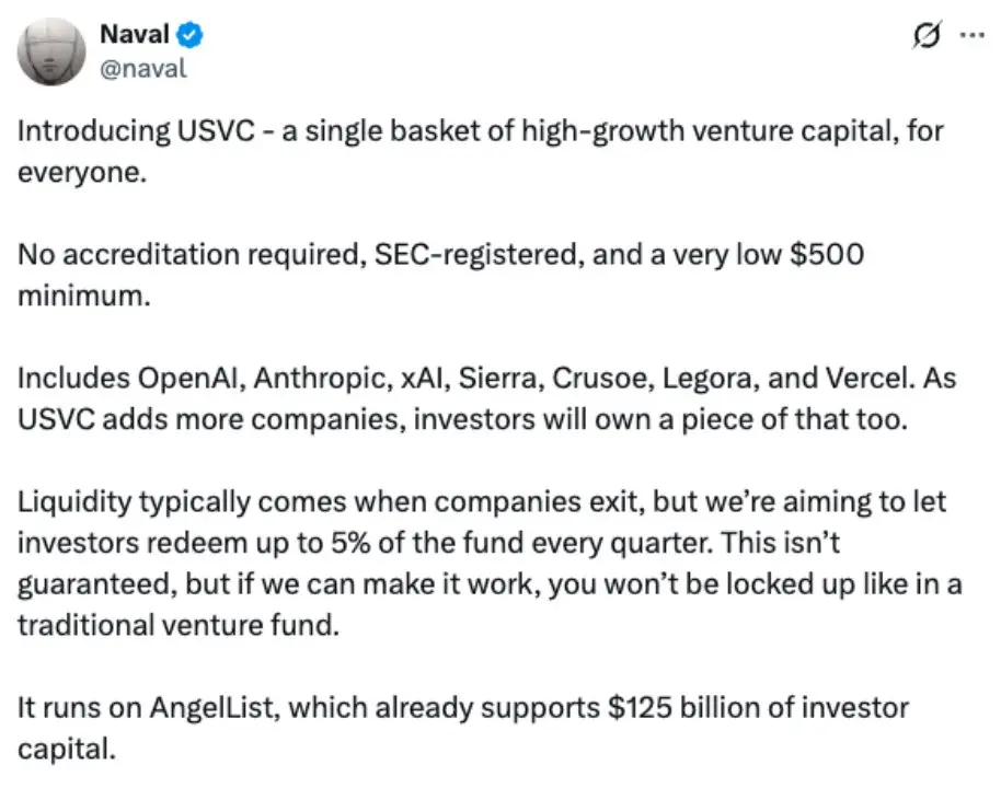 所以当 Naval @naval 选择站到 USVC 前台时,这件事就不只是某个新基金上线这么简单了。它更像是 AngelList 对过去十多年创业融资基础设施的一次零售化延伸。