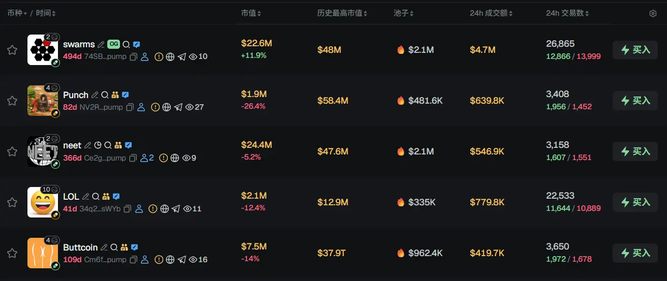过去 24h Solana 热门代币前五依次为:swarms、Punch、neet、LOL、Buttcoin