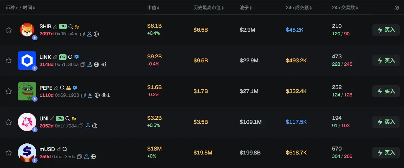 过去 24h ETH 热门代币前五依次为:SHIB、LINK、PEPE、UNI、mUSD