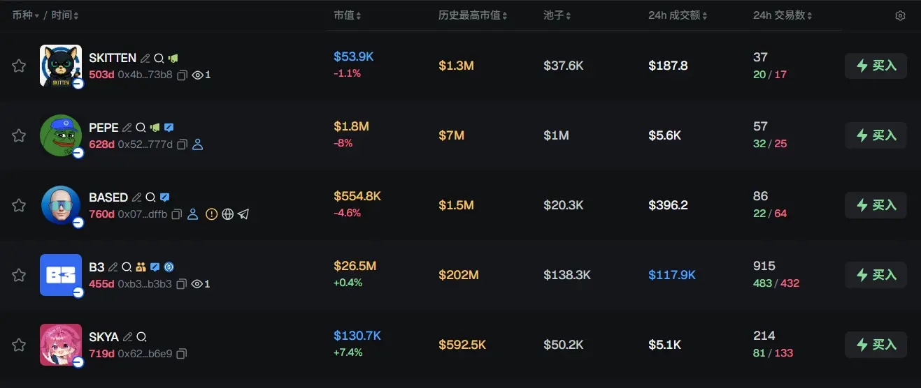 过去 24h Base 热门代币前五依次为:SKITTEN、PEPE、BASED、B3、SKYA