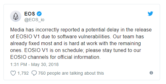媒体错误地报道了 EOSIO V1 可能因为软件漏洞而延迟上线。我们的团队已经修复了大部分漏洞,并且正在努力解决其他问题。EOSIO V1 会如期上线;请关注 EOSIO 发布的官方消息。