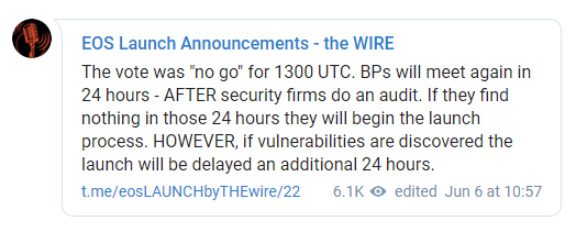 昨天的这场 BP 投票过后,期待已久的 EOS 主网依然无法上线。社区计划在安全公司完成审计之后再次进行投票,也就是 24 小时之后。到时候,如果 BP 并未发现任何漏洞,主网上线流程就会顺利进行。