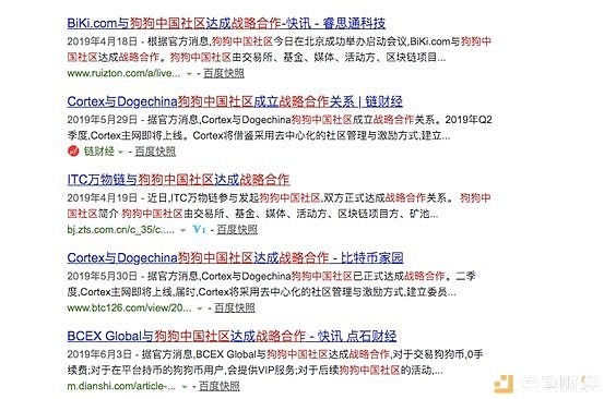 在百度搜索狗狗中国社区,可以看到,该社区于4月到6月间相继与BiKi交易所、ITC万物链、Cortex、BCEX交易所等币圈组织建立战略合作关系。