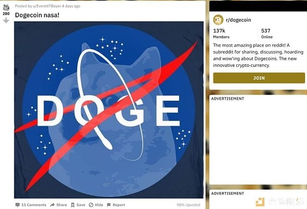在Reddit的狗狗币板块,有网友将NASA的LOGO PS成Doge表情包
