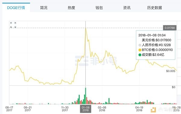 “这一波涨势很突然,也让人莫名其妙。”张海说。相比其他币种,狗狗币的“盘子”并不大,币价涨速十分可怕,“2018年1月初,币价几乎每天翻番。”