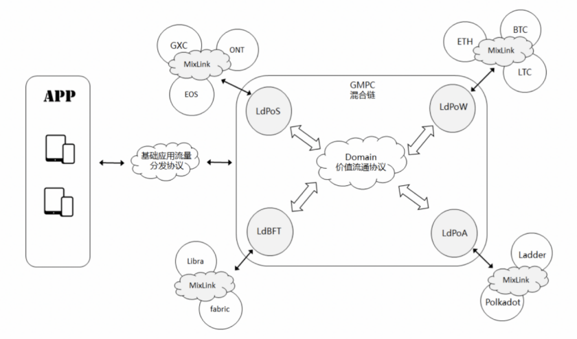 GMPC混合链可以看作多链联合的网格结构,由分布在全球上万个以上的去中心化验证节点维护。在整个区块链网格中,不同的区块链平台、链路上的资产和流量通过标准的混合链协议以及GMPC数据交互协议(即MixLink协议)进行混合链通信,实现不同区块链项目的资产与流量的流通。怎么理解呢?最外圈即原生链,我们可以看到有公链(BTC、ETH、LTC、GXC等),联盟链(Libra、Fabric等);里圈为GMPC提供的功能链域LD,根据共识机制的不同可以分为LdPOW、LdPos、LdBFT、LdPoA;原生链按照MixLink协议规范接入LD,LD与LD之间通过Domain价值协议联通,MixLink协议是面向应用的,依应用场景不同,每个原生链允许接入一个或多个LD,进而形成了整个网络,APP再通过基础应用流量分发协议接入网络,最终构成GMPC整个生态架构。