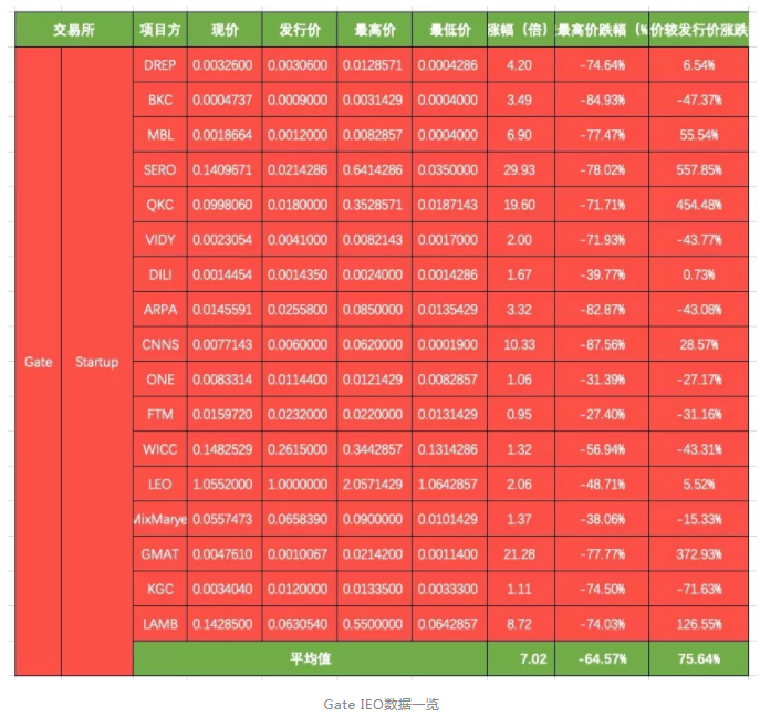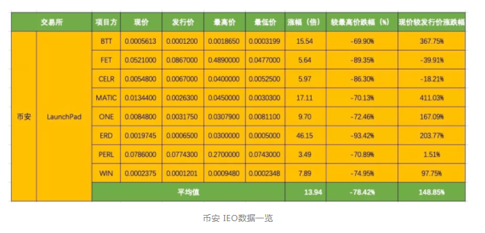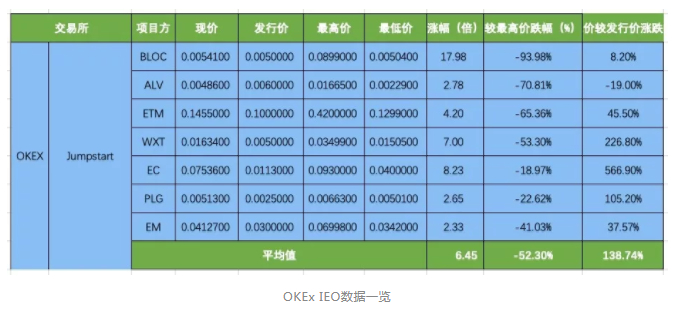 半年过去了,我们统计了OKEx、币安、火币、Gate四个主流交易平台的共51个IEO项目,通过数据或许能让我们窥出一些端倪。从31区的数据统计可以看到,四大平台的 IEO都曾有过暴涨暴跌的现象,多数IEO项目都难以维持币价。只有少数币安和OKEx的项目能保持一个良好的币价,那些炙手可热的IEO项目最少的都已经折腰,多的则出现高达80%-90%的跌幅。我们罗列了四大交易所的IEO数据。(数据截止到2019.9.11)