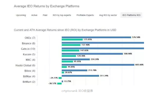 OKEx和火币这对老对手,在这次IEO的浪潮中似乎是完全不同的策略,火币更像是以量取胜,项目众多,几乎一周一次。OK则选择了一个更保守的策略,平均下来基本是一月一次,单纯从收益率上来看OK是成功的。而据crtptorank统计,OKEx的收益率曾一度领先所有交易所。