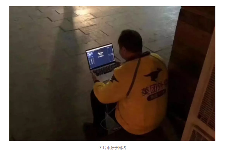 一位身穿美团外卖骑手服装的小哥,蹲坐在台阶上,用笔记本看火币Prime抢购页面。