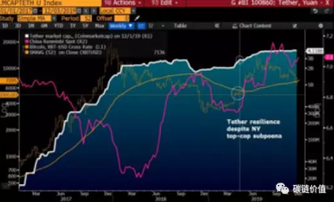 根据CoinMarketCap的数据显示,Tether一度在2019年12月份攀升至第四位,而在2017年底Tether市值排名大约是16位,相比之下,人民币同一时期下跌了近8%,而加密指数Bloomberg Galaxy Crypto Index则下跌了80%。