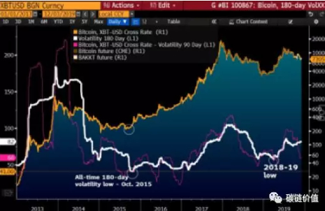 比特币波动性将会随着期货而有所下降。比特币价格波动性会在2020年有所缓解,从熊市到牛市的过渡显然已经结束。2020年,我们应该能重新见证180天波动率的历史低位(2015年10月为41%)。我们的分析图表不仅展示出这一指标的重要性,.还显示了该指标之前触底的状况,标志着抛物线反弹开始,甚至有可能会达到2017年峰值水平。日益增长的机构兴趣和敞口工具(比如期货、期权、Bakkt)都是市场利好因素,价格回笼可能性也越来越大,预计大部分价格区间会在6000-12000美元。