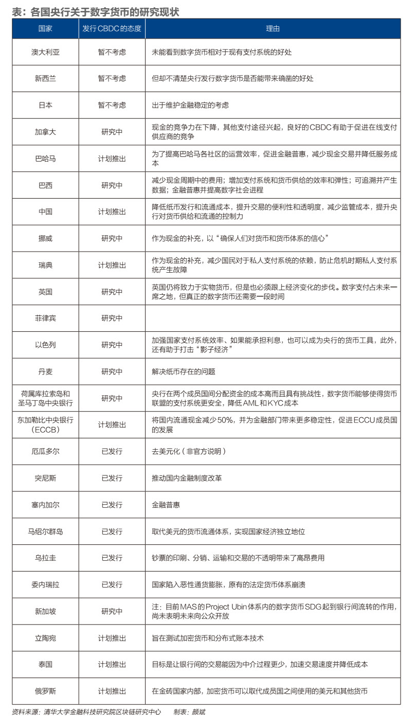 清华大学金融科技研究院区块链研究中心今年初发布的研究报告梳理了各国央行关于数字货币的研究现状。在25家央行中,计划推出CBDC(法定数字货币)的央行有7家,探索中9家,已发行6家,暂不考虑3家。